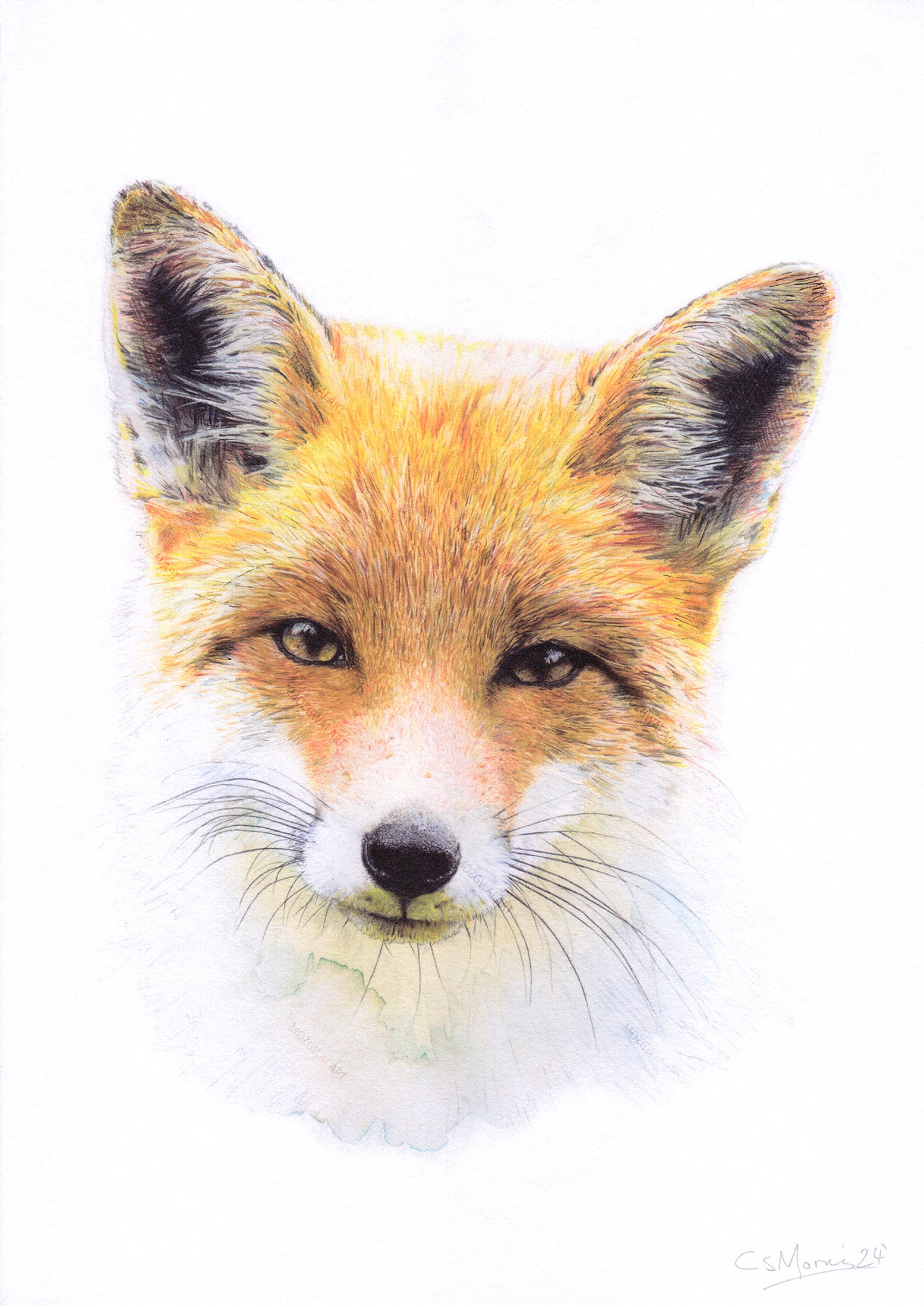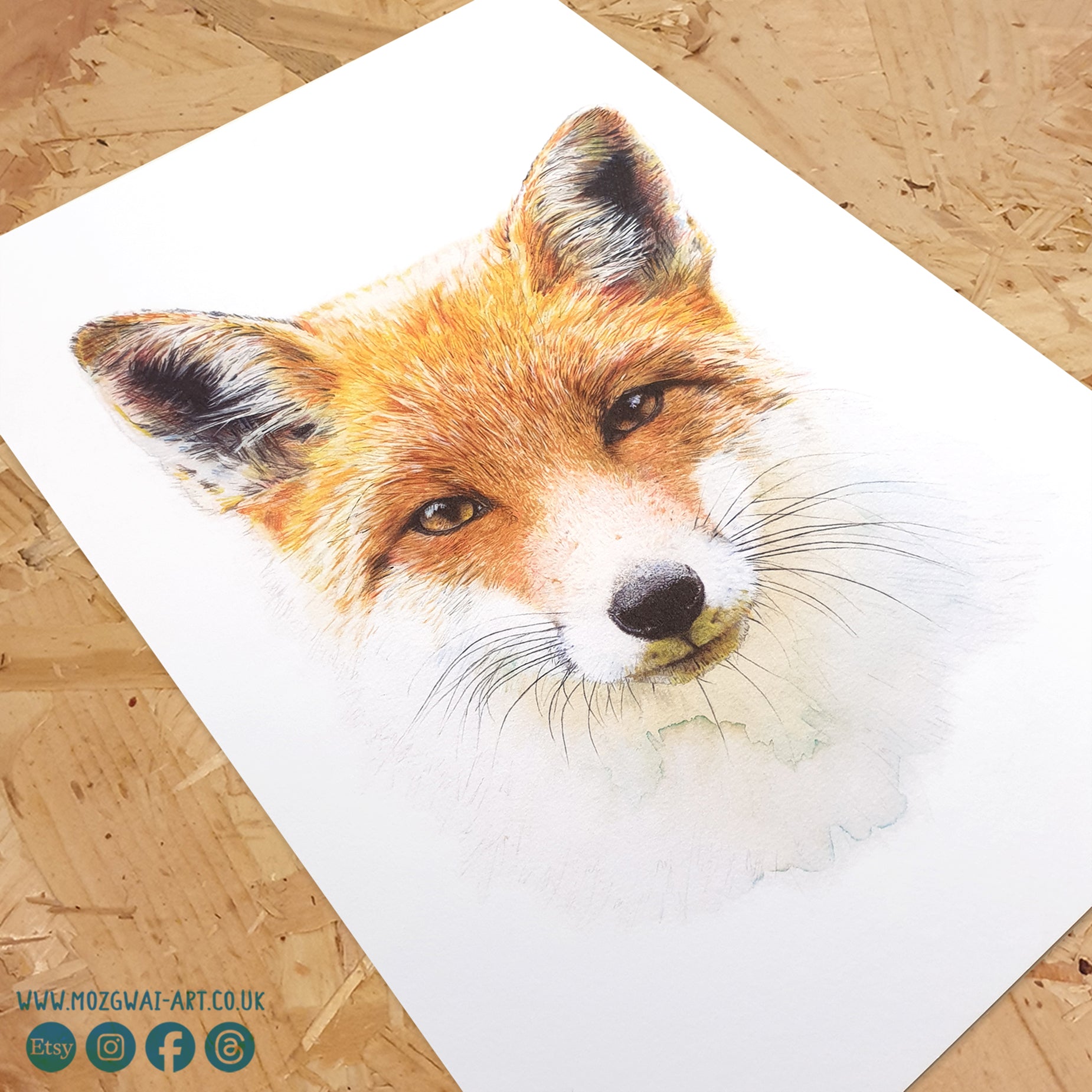 Transforma tu espacio en una obra de arte con este impresionante retrato de zorro realista. El intrincado y detallado retrato del zorro es una adición impresionante a cualquier habitación. Originalmente dibujado a mano con lápices de colores Faber Castell Polychromos y acabado con delicada acuarela.