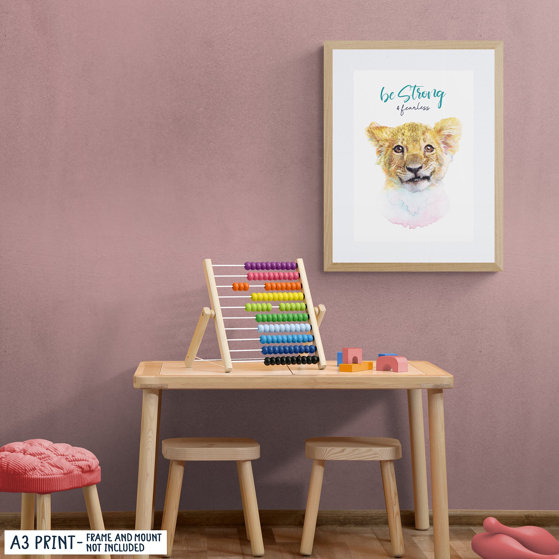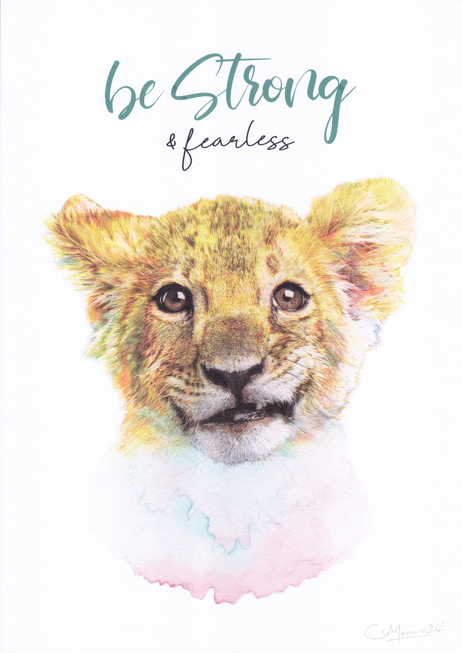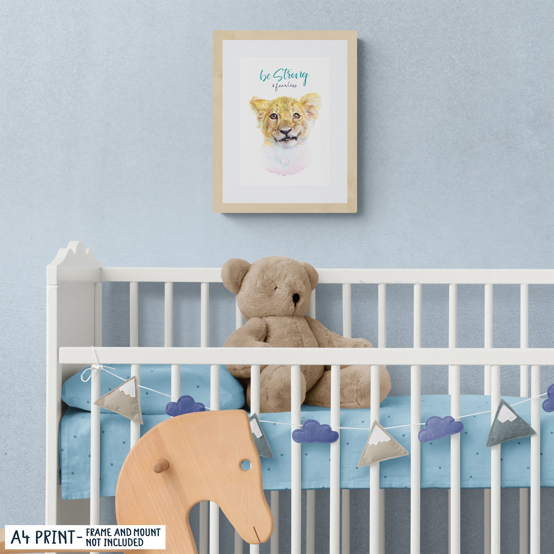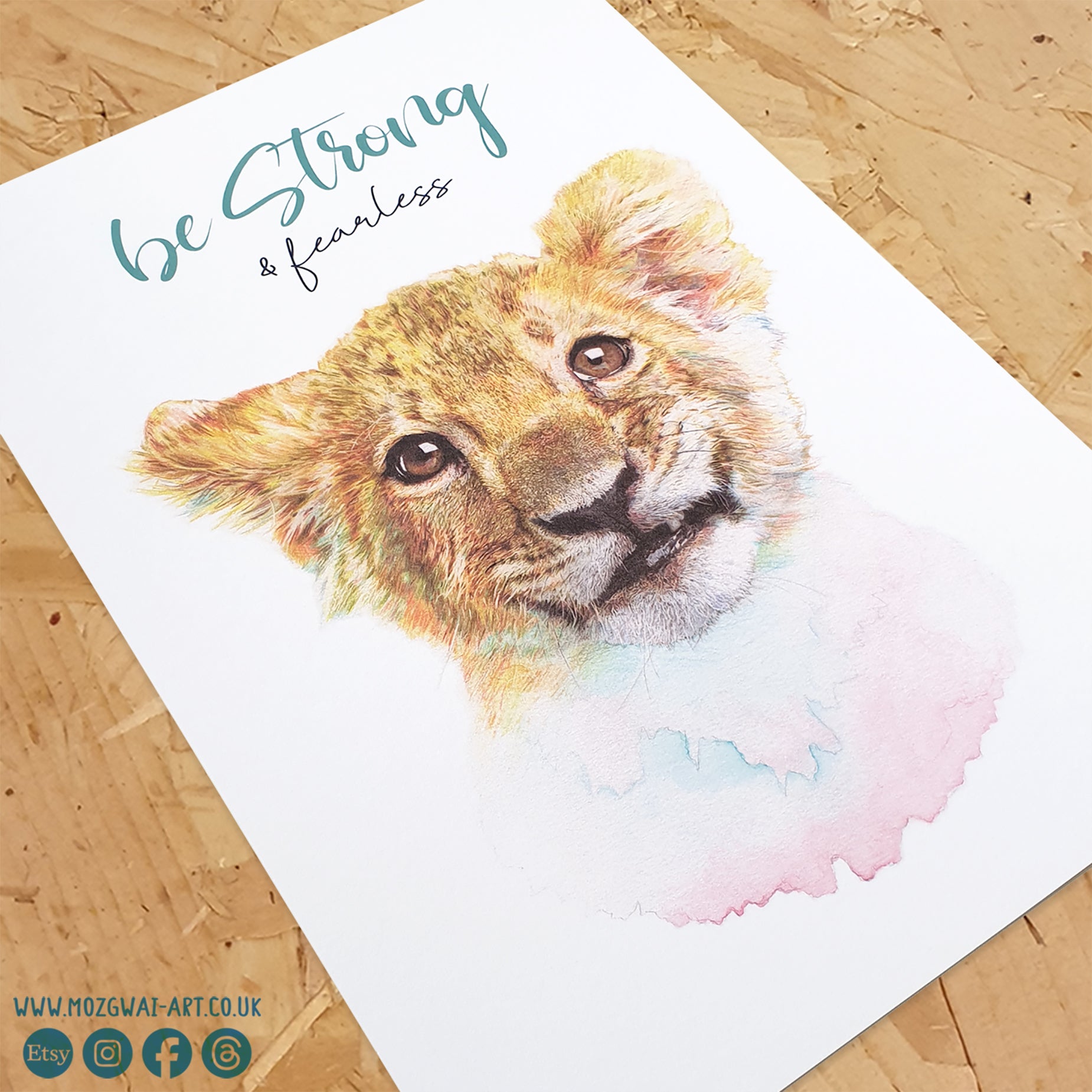 Esta impresión artística con cita de Lion Cub presenta el poderoso mensaje "Be Strong & Fearless" y aporta un toque encantador a cualquier guardería. Inspire valentía y resiliencia en su hijo con esta impresión de alta calidad. Originalmente dibujado a mano con lápices de colores Faber-Castell Polychromos y acuarela.