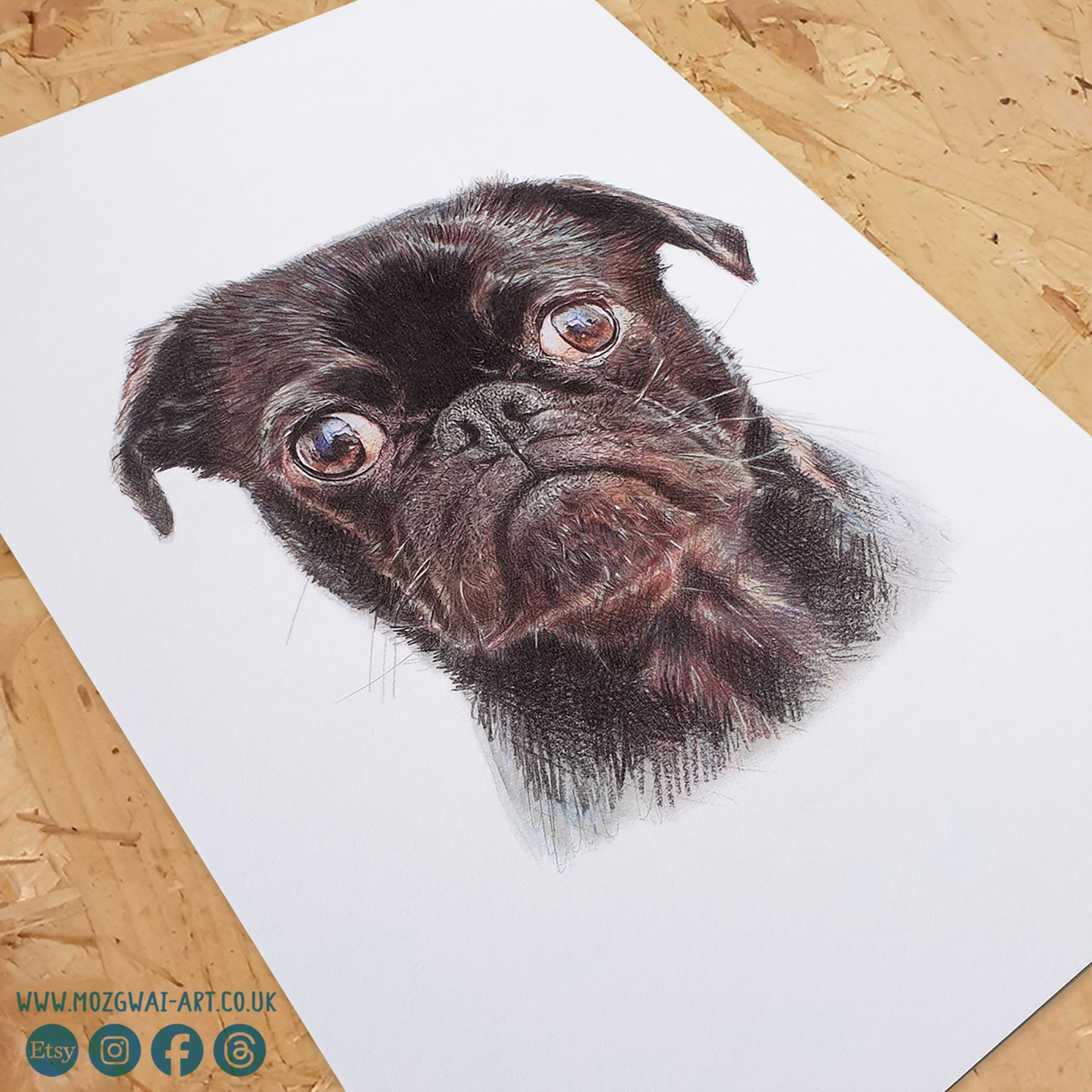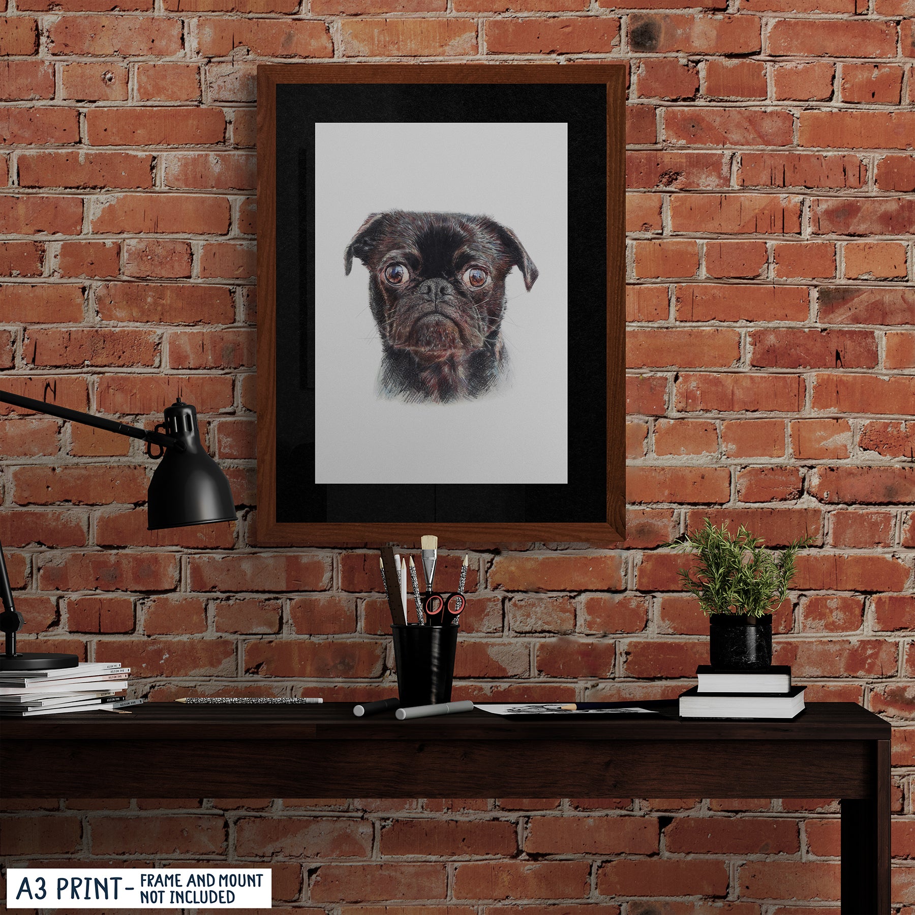 Capturando de manera experta cada detalle distintivo, este estampado realista de Pug es ideal para la colección de cualquier amante de los perros. Realizado con precisión y cuidado, nuestro estampado es la forma perfecta de añadir un toque de encanto canino a cualquier espacio. Originalmente dibujado a mano con lápices de colores Faber-Castell Polychromos.