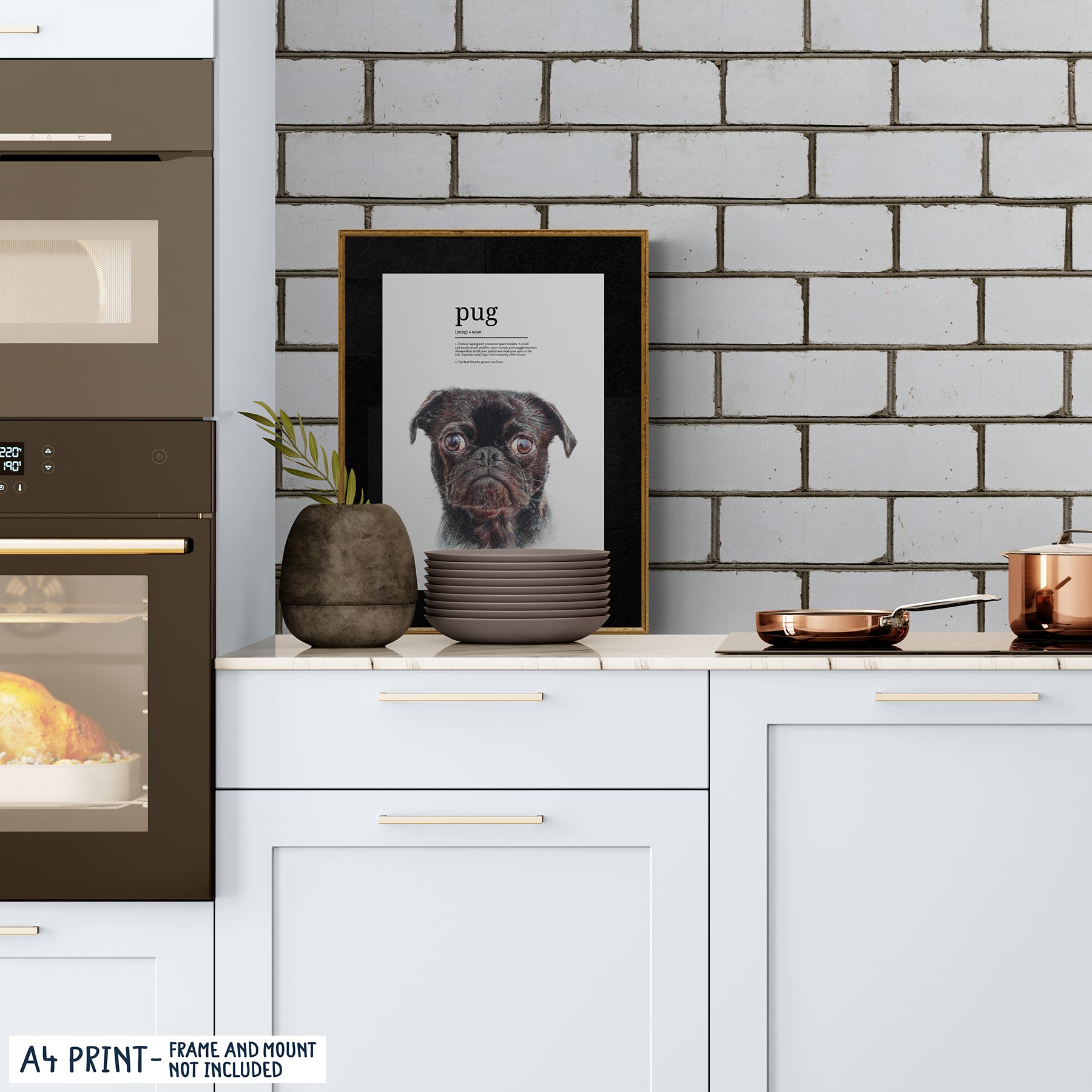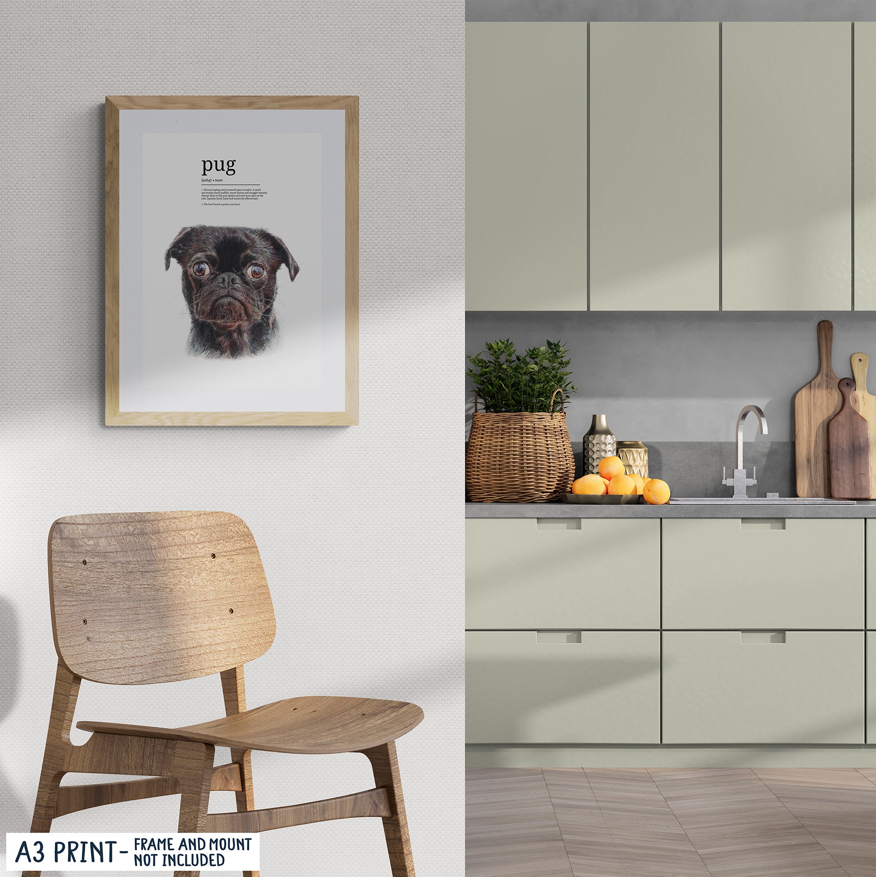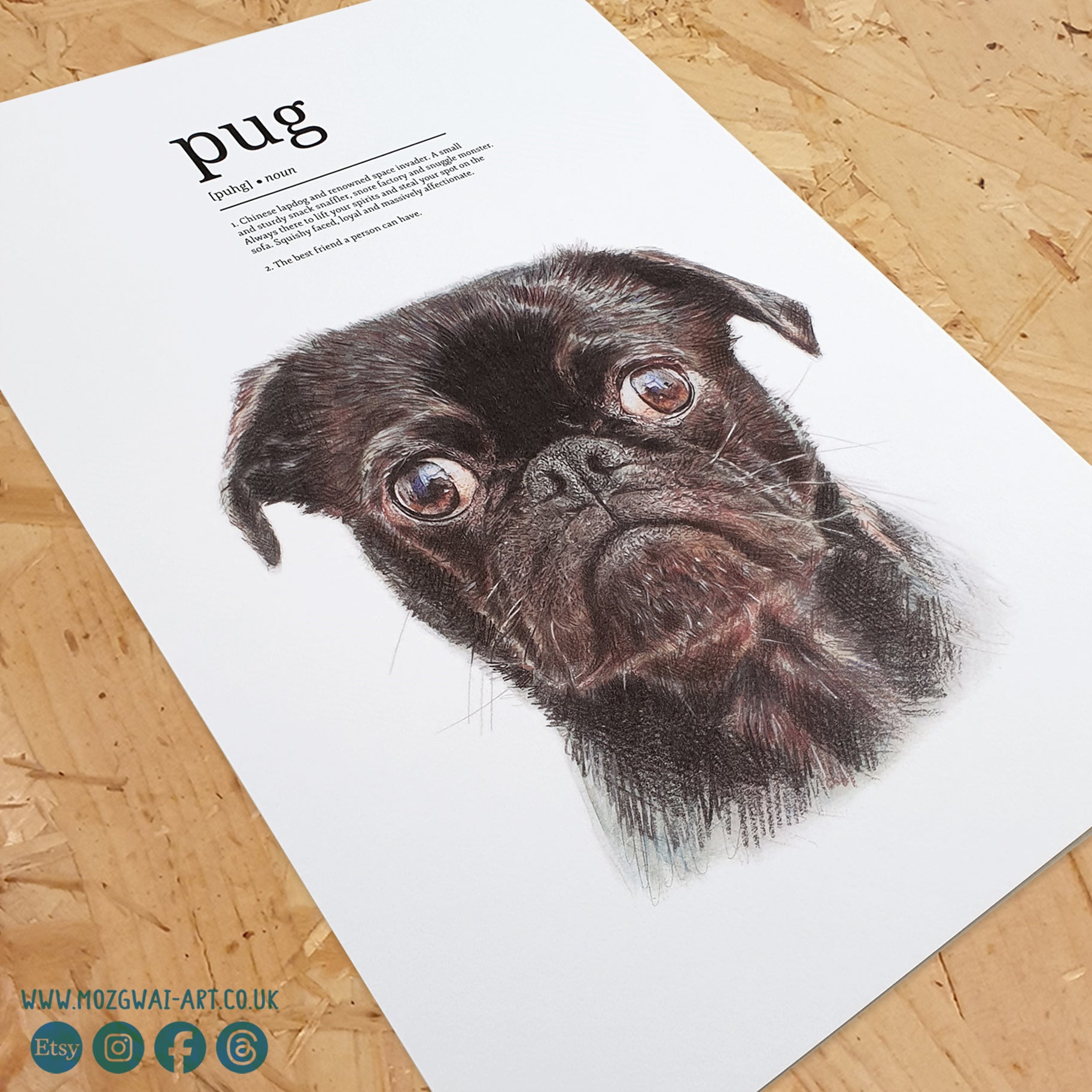 Esta impresión artística de un pug fantástico muestra una combinación perfecta de retratos realistas de Pug y una peculiar definición de diccionario para resumir su personalidad única. ¡Imprescindible para cualquier amante de los perros! Originalmente dibujado a mano con lápices de colores Faber-Castell Polychromos.