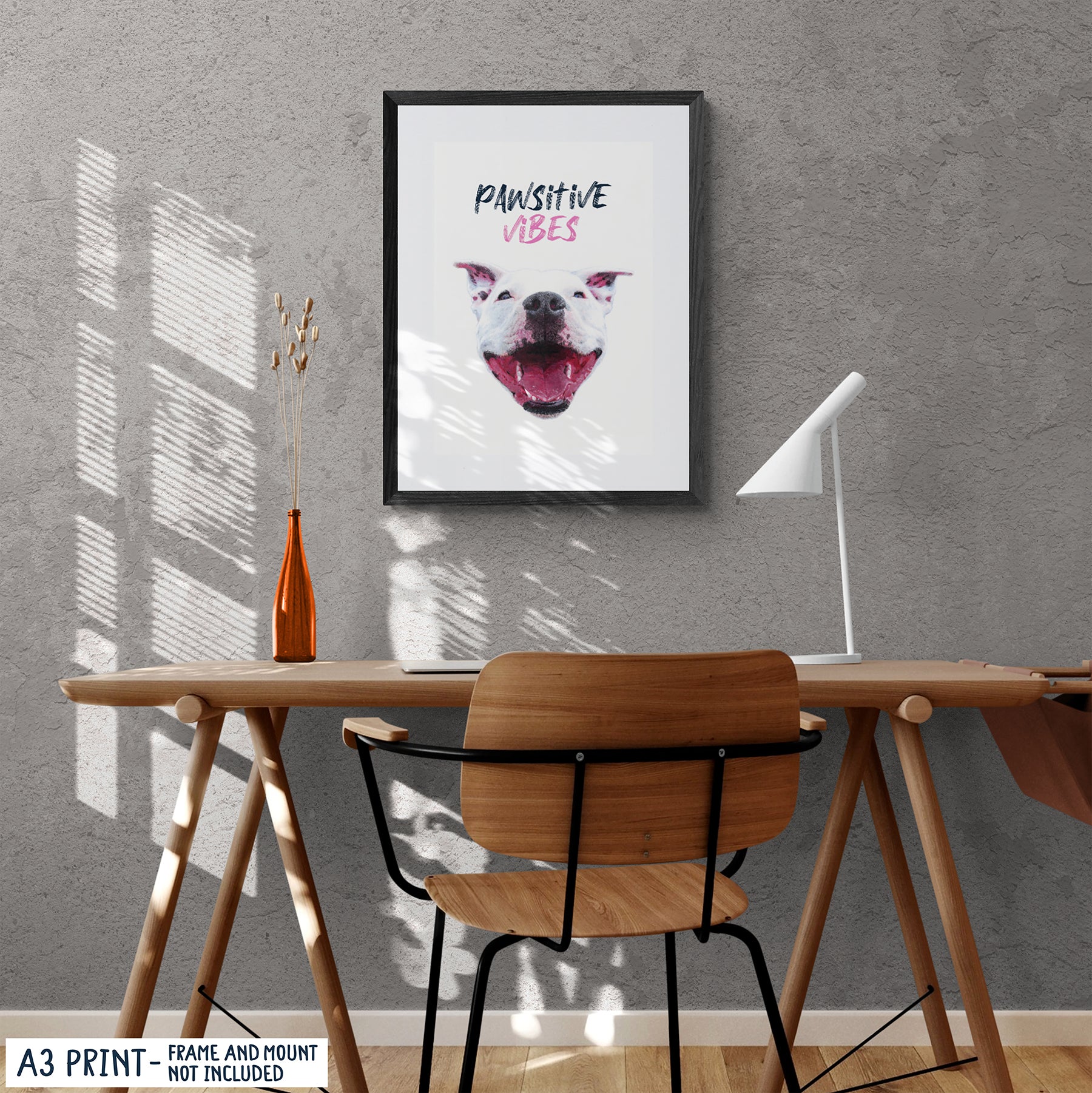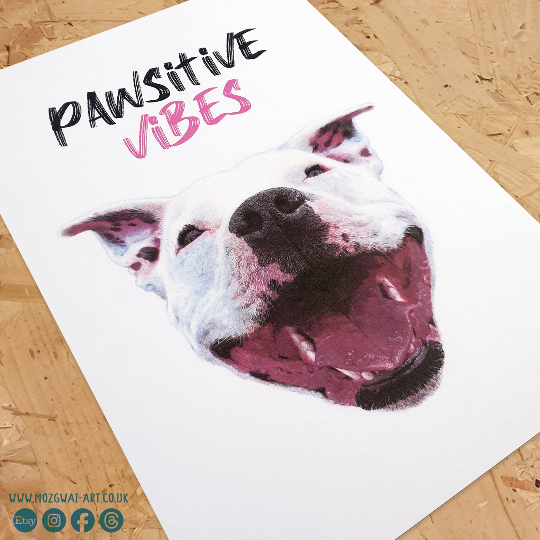 Deja que nuestra impresión artística Staffie te llene de "Pawsitive Vibes". Esta pieza impactante captura la energía y el carisma de esta adorable raza. Originalmente dibujado a mano con lápices de colores Faber-Castell Polychromos.