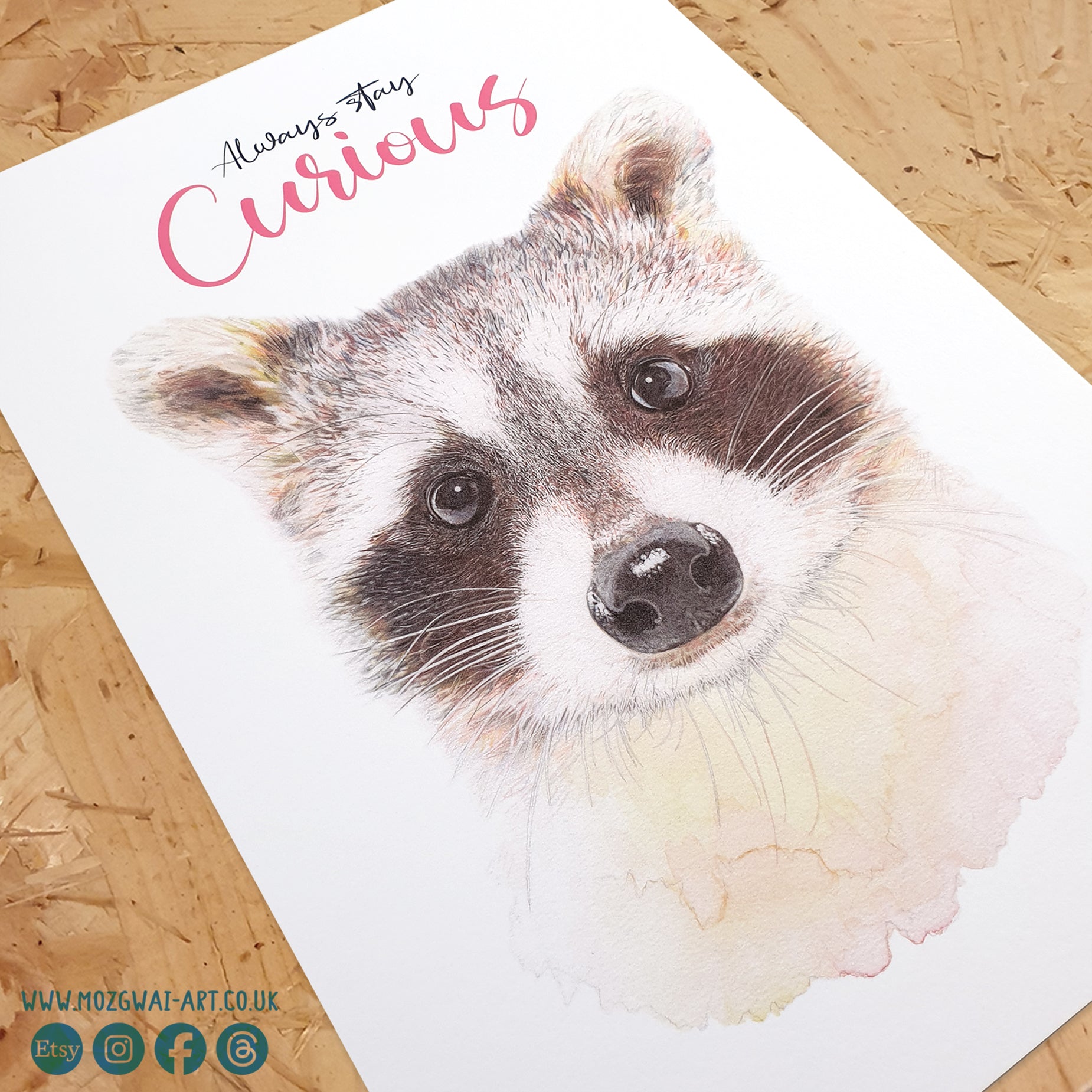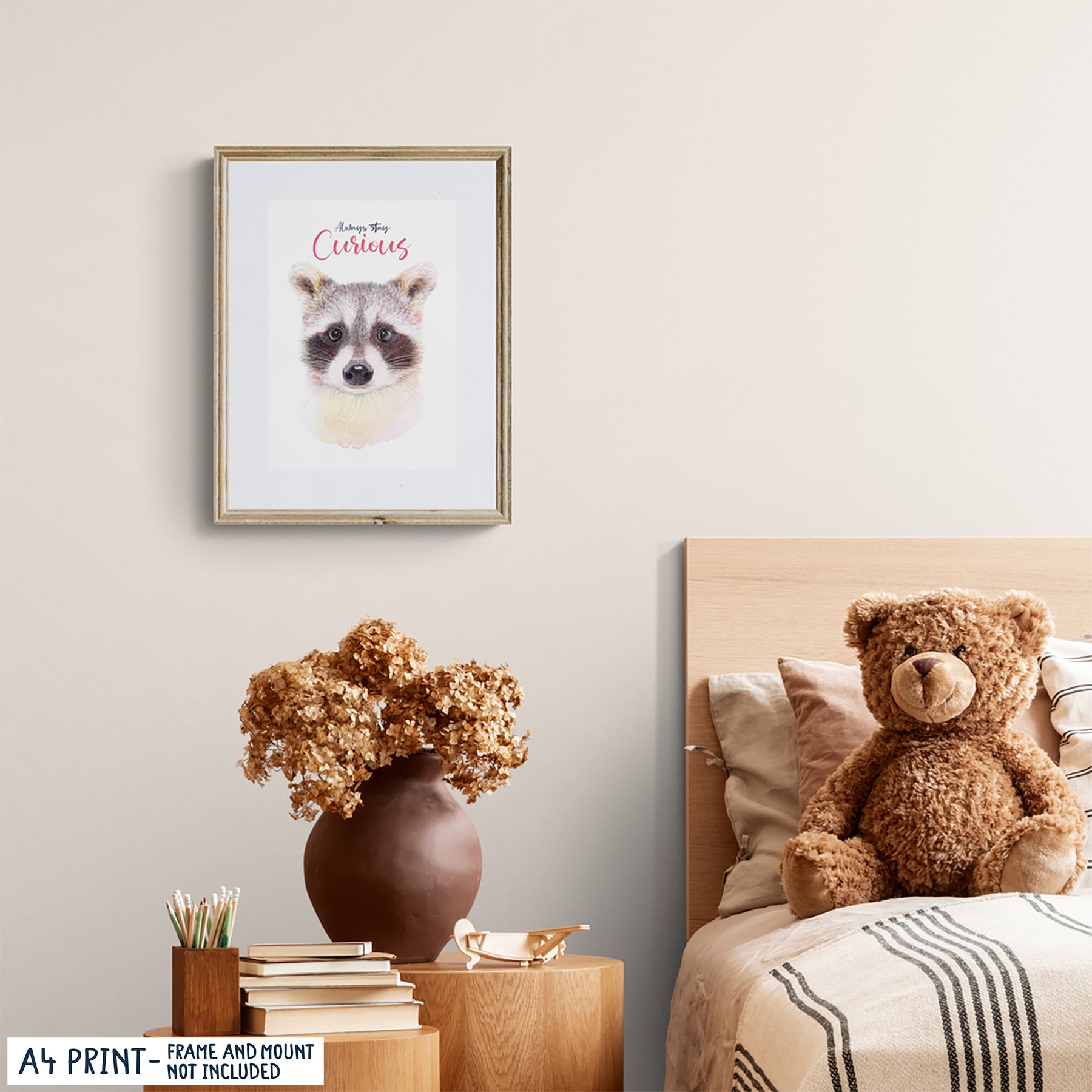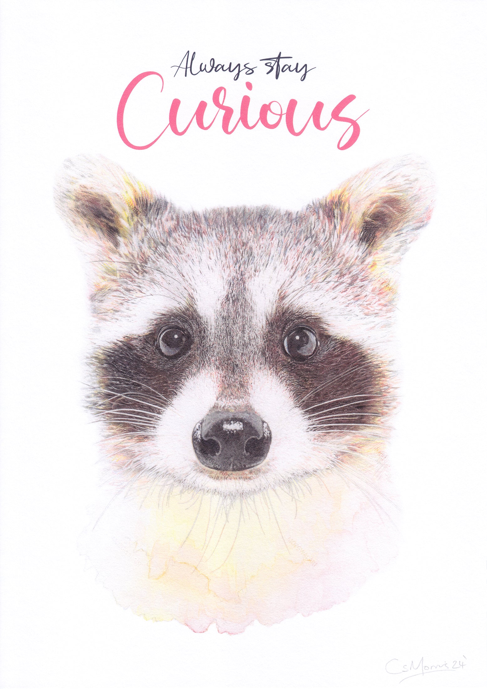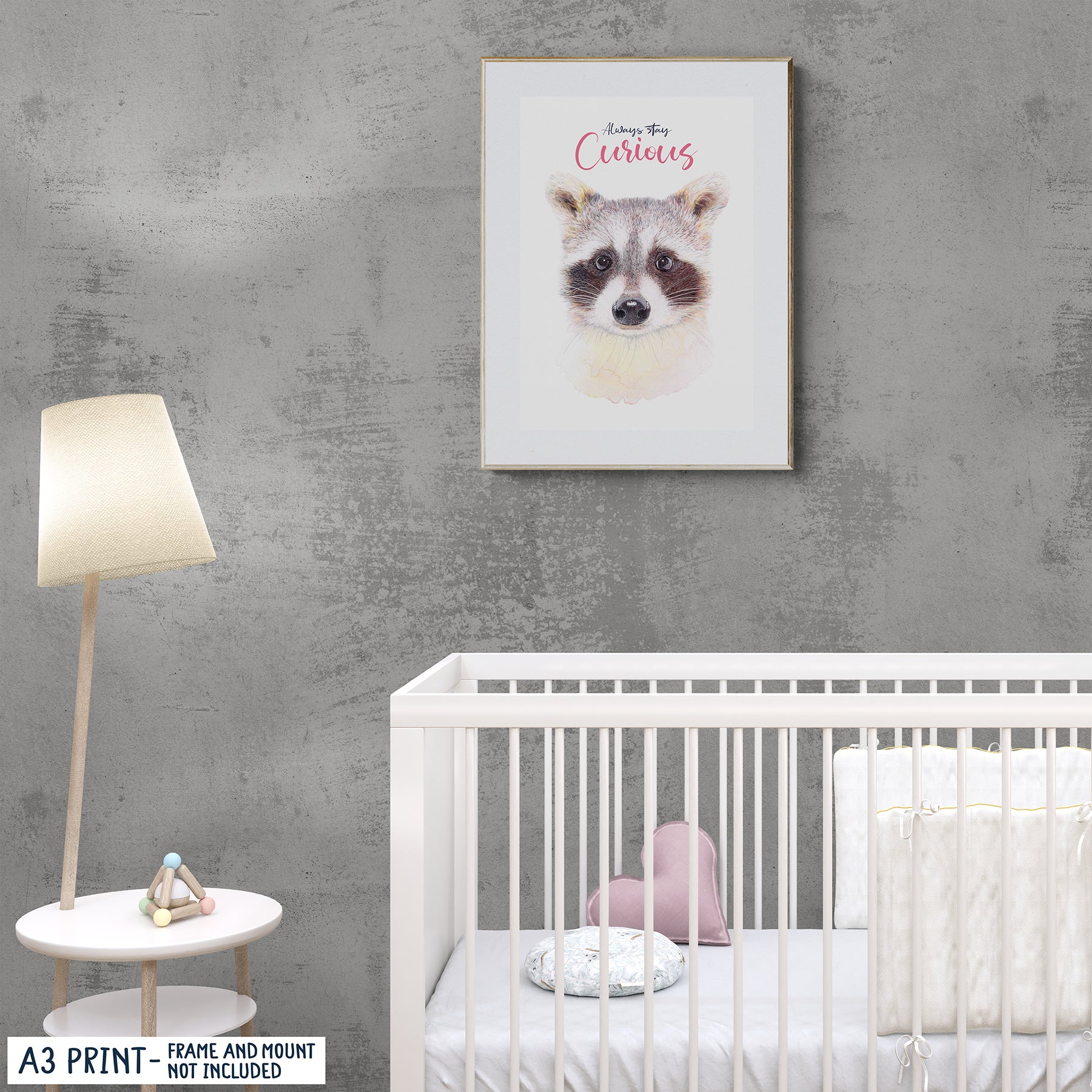 Con el motivador mensaje "Siempre mantente curioso", este retrato realista de un joven mapache le recuerda a tu hijo que nunca debe dejar de explorar y aprender. ¡Ideal para cualquier guardería! Originalmente dibujado a mano con lápices de colores Faber-Castell Polychromos y acuarela.